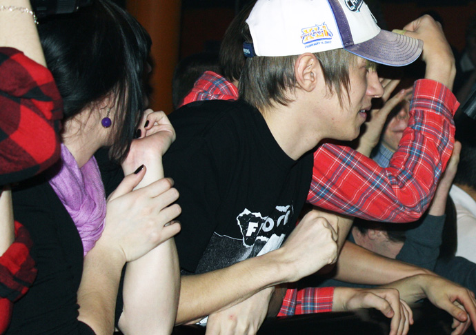 Выступление французской группы было довольно продолжительным. В течение него барабанщик активно общался с залом. И хоть говорил он по-английски, а зал отвечал по-русски, можно сказать, что все друг друга поняли и остались довольны. Это было ясно по поведению публики - пого (вертикальные прыжки в такт музыке), стэйдж-дайвинг и сёркл пит – это ничто иное, как одобрение музыкантов зрителями. А пожатие рук зрителей – признак удовлетворения от полученного приема. Незадолго до того, как группа вместе со зрителями удалились из помещения, я взяла интервью у гитариста «M-SIXTEEN» по имени Рено.