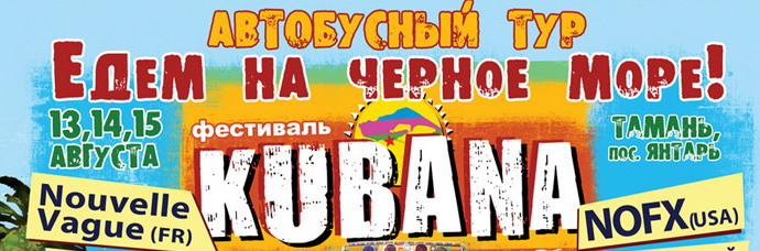 7. Достойно проводить лето получится у тех, кто выберется на трехдневный фестиваль «KUBANA», который пройдет с 13 по 15 августа на Таманском полуострове. На одной сцене выступят самые яркие представители разных музыкальных течений: поп, рок, альтернатива и т.д. Кто будет: NOFX, Ляпис Трубецкой, Сергей Шнуров и группа «Рубль»,[AMATORY], Ассаи,Тараканы!, Animal ДжаZ, Cheese People, Tequilajazzz, ЭЛИЗИУМ, Кирпичи, Salvador, Spitfire, Маша и Медведи, Tracktor, Лаванда.
