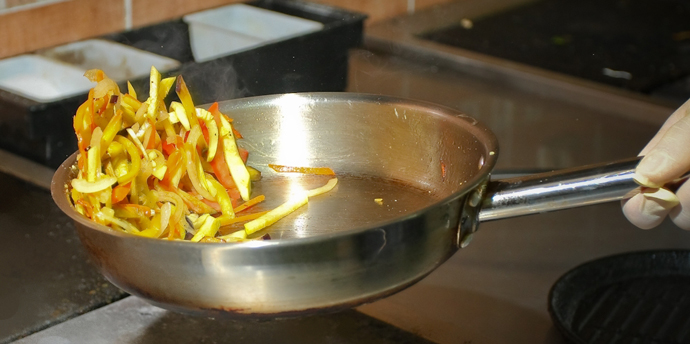 2. Пока маринуется мясо, готовим сладкий перец, фаршированный овощами. Для него нам понадобятся: морковь, баклажан, кабачок, томаты. Если есть время, и рядом нет голодных друзей, заранее замачиваем баклажан в воде – так пропадет лишняя горечь. Все нарезаем тонкой соломкой. Кладем на разогретую сковороду с оливковым маслом сначала морковь, потом кабачок и баклажан. Обжариваем, чтобы овощи стали чуть мягкими. При обжарке добавляем немного сухого белого вина, тыквенные семечки и кедровые орешки. Томаты режем кубиками и добавляем на сковороду в последнюю очередь.