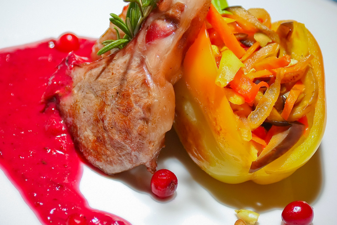 7. Конечно, можно сразу же обмакивать готовые ребрышки в чашу с соусом, закусывая фаршированным перцем. Но ведь мы готовим с профессионалом, а это значит, что красота блюда для нас не менее важна, чем его вкус. А потому начинаем сервировку. Перец с овощами выкладываем на центр тарелки. Мясо - сверху, соус - рядом. Украшаем блюдо ягодами клюквы, веточкой розмарина, тыквенными семенами и кедровыми орешками.