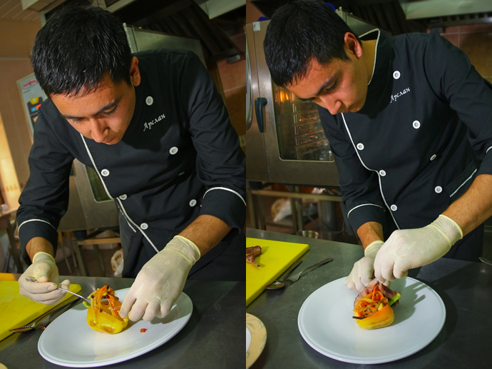 3. Болгарский перец надрезаем в форме «лодочки» (право именно так обозвать эту фигурку из перца Арслан любезно предоставил нам), аккуратно удаляем семена. Перцу придаем колер на сковороде (переводя на язык любителей – поджариваем равномерно с нескольких сторон).