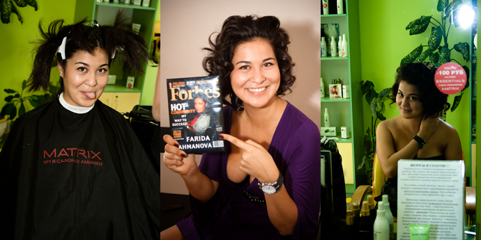 Из этих же соображений, был выбран наряд для праздничного вечера. Одежду Фарида принесла с собой, причем некоторые элемента ее гардероба были жестоко раскритикованы Аленой и Галиной. В итоге, выбор остановили на темно-фиолетовом платье, не скрывающем достоинств нашей героини, туфлях на высоком каблуке и этнических серьгах. С прической и макияжем имениннице вызвались помочь мастера салона красоты «SAVAGE». Фариде вернули естественные кудри, которые она ежедневно укрощает утюжком для выпрямления, а в макияже посоветовали сделать акцент на глаза. Пока Людмила - очаровательная хозяйка салона колдовала над нашей именинницей, мы забрасывали ее вопросами о моде, красоте и прочих девичьих штучках. И на каждый вопрос нам выдавали развернутый ответ. Так что если захотите получить полноценную бьюти-консультацию и примерить на себя новый образ – приходите в «SAVAGE». Тем более, здесь потрясающие обои фисташкового цвета и подсолнухи на стенах – есть чем вдохновиться.