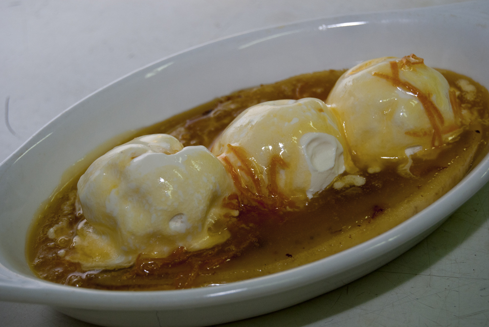 На тарелку, где «прохлаждается» банан, выкладываем три шарика мороженого. Поливаем готовым горячим соусом.