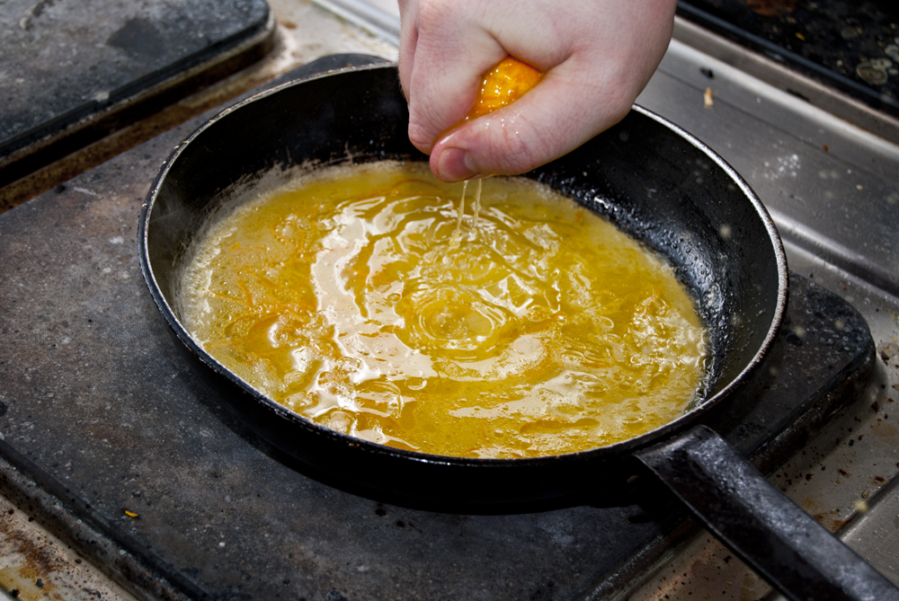 Добавляем на сковороду апельсиновый сок, туда же кладем цедру апельсина и выжимаем оставшуюся мякоть. Варим минут семь. Соус готов!