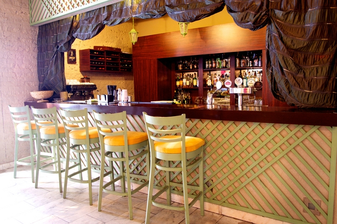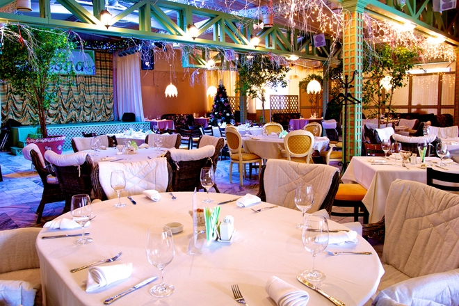 В основном зале - мягкие плетеные стулья, просторное помещение утопает в убранстве из цветущих деревьев и растений, интерьер и украшения оливковых и бежевых тонов успокаивают и расслабляют. Все это дарит ощущение, что Вы не в ресторане, а где-то за городом, решили провести свой выходной в собственном огромном доме. Но это еще не все.