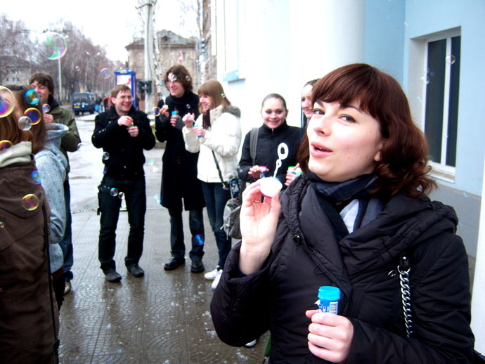 А между тем прохожие и знать не знают, что все это зовется «дримфлешем» или «парадом мыльных пузырей». Dreamflash («dream» - мечта, «flash» - вспышка) часто называют флешмобом. Но парад мыльных пузырей имеет свои особенности. Во-первых, открытую организацию (для флешмоберов главное – сохранить тайну), а во-вторых – довольно-таки длительный маршрут. Так что приставка «flash» здесь, наверное, не совсем к месту – не такое уж это и краткосрочное мероприятие.Хотя дримфлеш – это явление сугубо развлекательное, ему периодически придают идеологическую окраску. Так, например, в Москве любители мыльных пузырей устроили радужную акцию протеста против коммерциализации Старого Арбата и превращения его в магазин для туристов. Теперь каждый год славный «моб», объединенный девизом «Мечты не купишь», двигается вдоль всего Арбата, украшая его миллионами разноцветных пузырей. «Мы предлагаем отказаться от стереотипов и радоваться жизни так, как это делают дети», - рассказывают бывалые дримфлешеры. В столице эта акция проходит на уровне любительского карнавала: участники одеваются ярко, броско, вычурно, шумят и всячески привлекают к себе внимание. Как правило, праздник мыльных пузырей собирает до пяти тысяч участников. Вообще, дримфлеш – это интернациональный проект, только проводиться он у всех в разное время. К примеру, итальянцы на прошлой неделе уже «надули» свою площадь Пьяцца дель Пополо. А вот Москва наметила своё событие на 11 апреля. А мы, Тольятти, планируем «зафестивалить» на две недели позже.