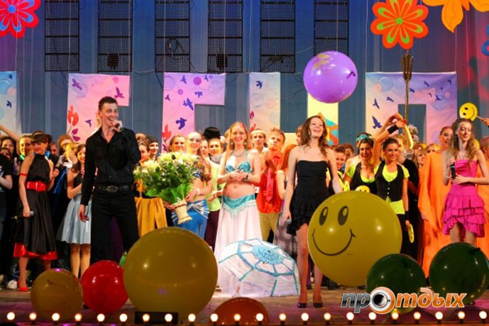 Еще до третьего звонка захожу в зал, а там уже вовсю танцы. Организаторы продумали фишку а-ля флешмоб: все танцоры-участники выстроились вдоль стен зала и уже отжигают по полной. Спустя какое-то время начинается гала-концерт «Весеннее сумасшествие». Программу открывает театр теней, где из человеческих фигур составляется слово «ВЕСНА». Вокальные номера сопровождаются показом дизайнерских изысков от студентов университета. Так номер Нуждиной Клавдии украсило дефиле в одежде дизайнеров Лосевой Елены и Султамбековой Лилии. По всей видимости, отправной точкой креативного мышления девушек стали наряды Lady Gaga.