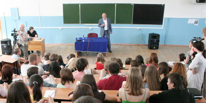 Загорелый и бодрый телеведущий был открыт для разговора на любые темы. Но, поскольку аудитория была преимущественно с кафедры журналистики, говорить стали именно о тех, чей главный хлеб  – информация. Рассуждая о свободе слова, Познер сказал: «Я не имею права кричать «Пожар!» в битком набитом кинотеатре только потому, что мне хочется кричать «Пожар!». Ответственность, по словам Владимира Владимировича, является главным цензором для тех, кто работает в СМИ.